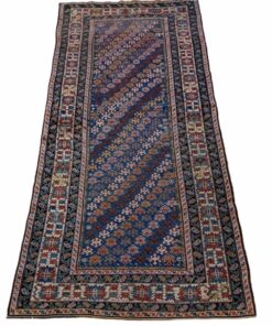 Ce tapis du Caucase Shirvan Kuba date du XIXème autour de 1880. Il est entièrement noué main et les colorants utilisés sont d’origine végétale. Motifs en diagonale dans le champs central et bordures à décor arménien. Il est 100% laine, dans son jus et ira très bien dans un intérieur moderne ou classique.
