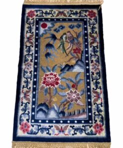 Ce tapis chinois vintage a été tissé vers 1940. Il est entierement noué à la main, sa trame est en soie et fils d’or, son velours laine&soie. Il est dans un très bon état de conservation et des oiseaux, papillons et fleurissent le décor de ce tapis. Il peut s’accrocher au mur ou aller aux pieds d’un lit.