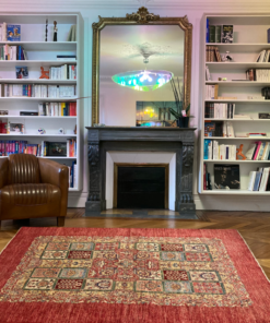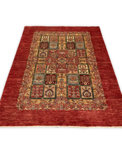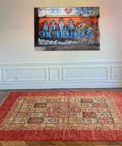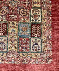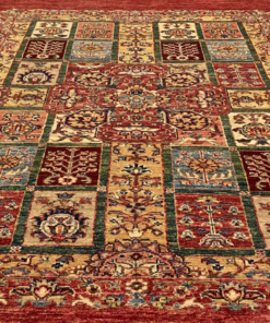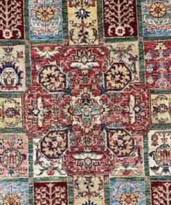 Tapis moderne 100% fait main tissé en Afghanistan et issu du commerce équitable. Sa trame est en coton et son velours laine est doux. Ses motifs reprennent les quatre saisons que l’on retrouve sur les tapis persans. Sa densité de noeuds au M2 lui permet aussi bien d’être dans une pièce de grand passage, un salon, ou même une chambre.
